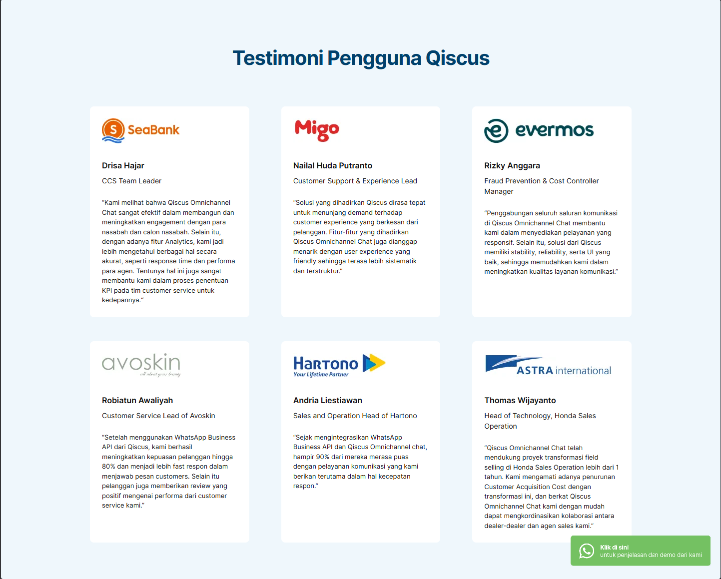 Qiscus is an omnichannel customer engagement platform that helps businesses to provide a better customer experience through various channels. We helped Qiscus to build their landing page and dashboard to be more premium and user-friendly.